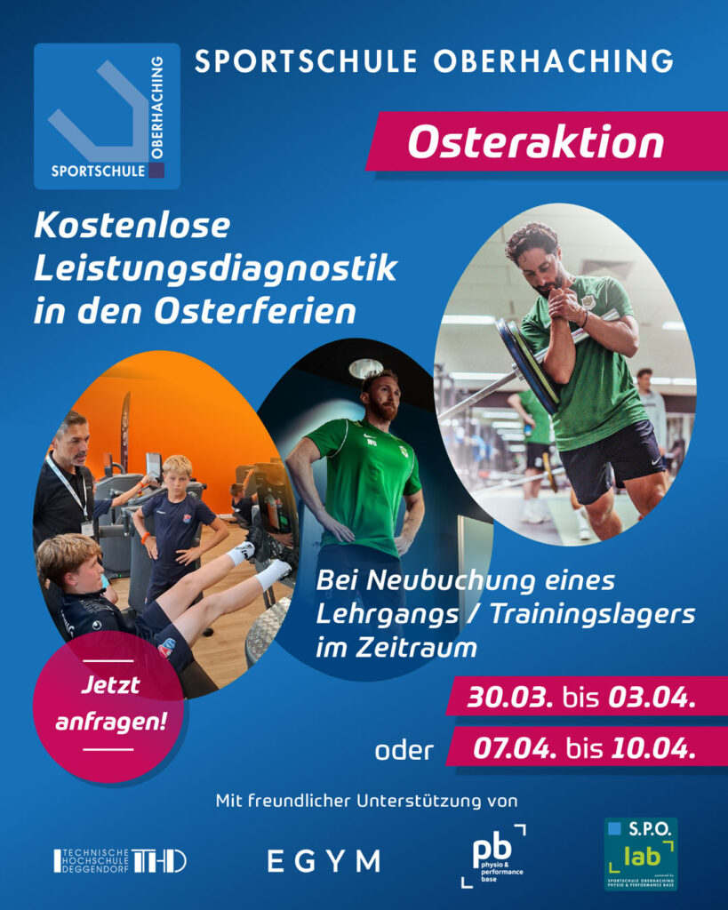 In den Osterferien starten wir an der Sportschule Oberhaching eine exklusive Aktion für Vereine und Lehrgangsgruppen: Bei Neubuchung eines Trainingslagers oder Lehrgangs in unseren Aktionszeiträumen erhaltet ihr eine kostenlose Leistungsdiagnostik für eure Gruppe!